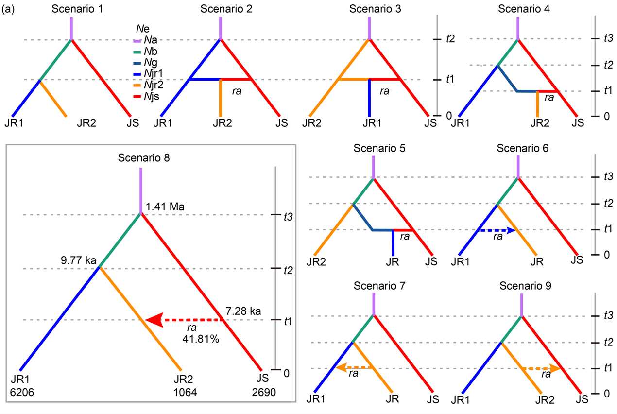 图3 亚洲胡桃和泡核桃的群体演化历史。设定了9种可能的情景(Scenario1-9),最佳模型为情景 8;t1、t2和t3为群体分化或杂交事件发生的时间,箭头代表基因流方向。