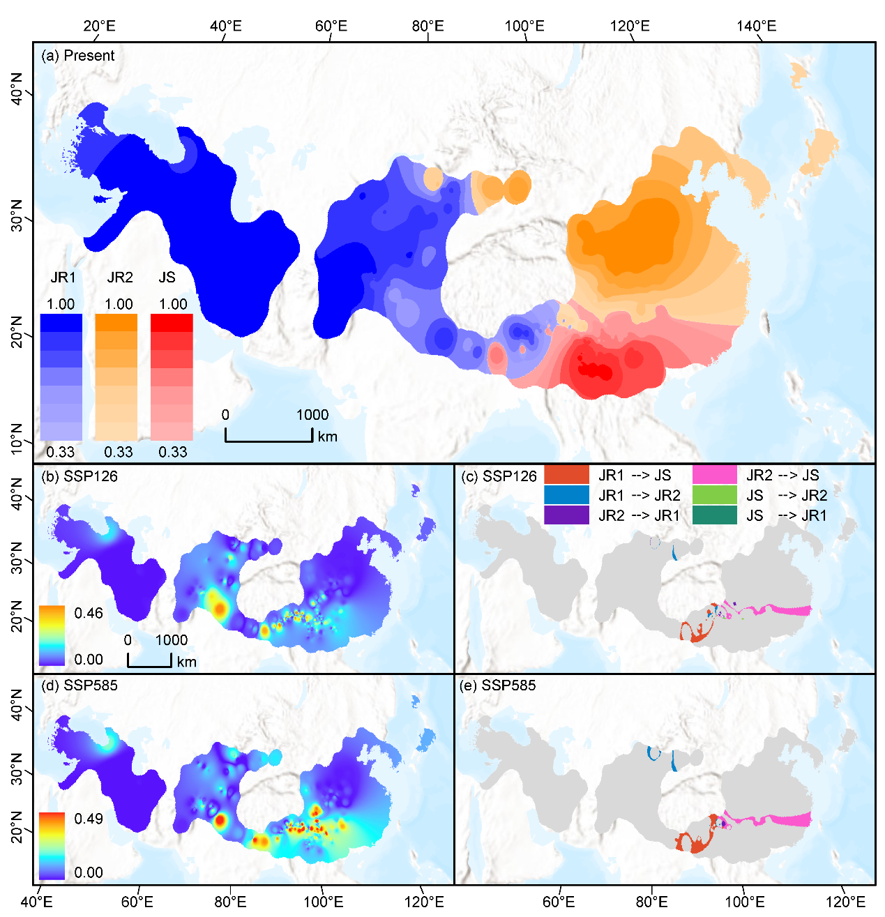 图4 当前亚洲胡桃和泡核桃的群体遗传结构(a)及未来气候情景下的潜在遗传结构周转强度与趋势(b-e)。