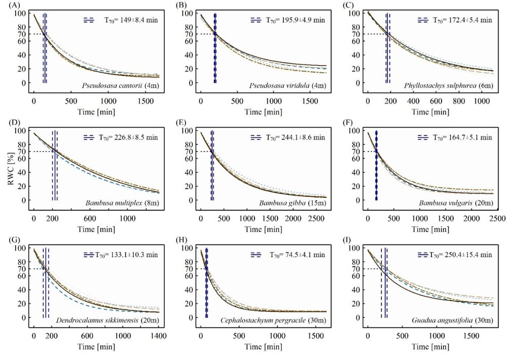 近日,中国科学院西双版纳热带植物园(以下简称“版纳植物园”)植物逆境生态学研究组研究人员选择了9种具有不同最大高度(2.6米至40.8米)竹子,通过稳定性同位素分析、叶片持水能力及解剖结构研究,系统测定其水分吸收深度、叶片保水能力及干旱响应过程中泡状细胞形态特征的变化。研究结果表明所有供试竹类50%的水分来自30厘米以上的浅层土壤,且叶片饱和含水量低、脱水速度快(到达70%含水量的脱水时间74.5-250.4分钟),表明竹类植物普遍具有浅根系及较弱的叶片持水能力(图1)。进一步研究表明,叶片保水能力与旱季正午水势呈显著正相关,而泡状细胞占叶横截面积比例是影响叶片卷曲效率与保水能力的关键解剖性状。研究同时发现,干旱过程中叶片泡状细胞密度高且细胞体积较大的竹种,能在失水早期快速驱动叶片卷曲以减少暴露面积,显著提升旱季黎明前叶片水势。并在正午最大限度降低蒸腾失水,使其正午维持相对较好的叶片水分条件(图2)。值得注意的是,竹类株高与叶片水势无显著关联,提示高大竹种可能通过茎秆储水等补偿机制抵消高度带来的水力劣势(图3)。