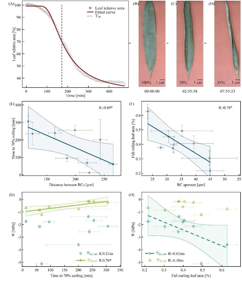 图3.竹类植物叶片的卷曲行为以及其对叶片水分和水势调控的作用