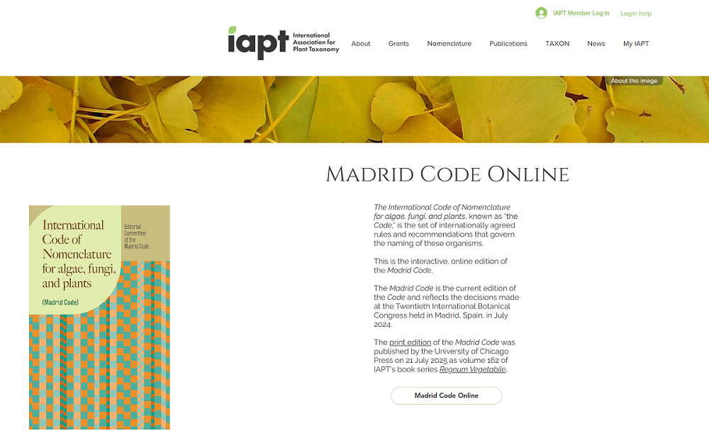 2025年7月,新版《国际藻类、菌物和植物命名法规》(International Code of Nomenclature for algae,fungi,and plants (Madrid Code) 简称ICN)(即《马德里法规》)作为国际植物分类学会(IAPT)的旗舰连续出版物Regnum Vegetabile(《植物界》)第162卷已由美国芝加哥大学出版社出版发行。《马德里法规》是由2024年7月在西班牙马德里召开的第20届国际植物学大会命名法分会讨论修订,并经大会批准的最新版本,取代由2017年7月第19届国际植物学大会(中国深圳)批准并于2018年由Koeltz Botanical Books出版的《植物界》第159卷的《深圳法规》。近日,《马德里法规》电子版已在国际植物分类学会(IAPT)官网正式在线(https://www.iaptglobal.org/madrid-code-online),供全球植物学、菌物学和藻类学及相关学科科研人员免费查阅。