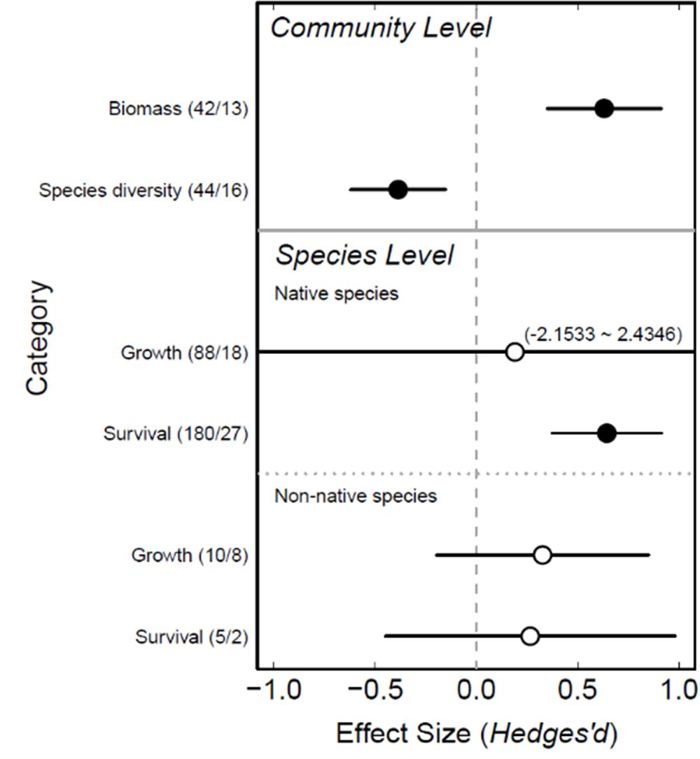 使用杀菌剂对群落水平生物量、生物多样性以及物种水平生长和存活影响的效应值