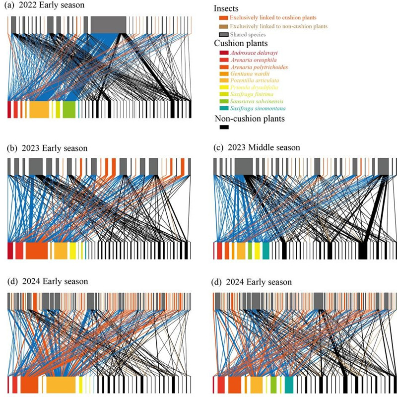 其次,研究人员基于物种互作理论和方法,连续三年系统监测了横断山高山冰缘带同一群落内九种共生垫状植物在不同物候期对昆虫多样性及其群落动态的影响。研究发现,垫状植物始终比其他物种维持着更高的昆虫物种与个体数量,其物种数量高出3.5-4.2倍,个体数量高出4.5-8.8倍。通过在不同季节维持7-46种“特有”昆虫物种,垫状植物使群落昆虫总物种数提升25.93%~112.20%,个体总数提升2.31%~41.64%。网络结构(图2)分析表明,垫状植物处于更核心的网络位置(即具有更高的近中心性与中介中心性),常作为网络模块枢纽或连接节点,而其他植物则多处于网络边缘。物种灭绝模拟结果进一步印证了垫状植物在群落中的核心生态地位:若优先移除垫状植物,昆虫群落存续能力将出现最快速衰退;相反,在优先移除其他植物物种的情境下,昆虫群落呈现最慢的二次灭绝速率(图3)。该研究证实了垫状植物是高山冰缘带生态系统中植物-昆虫互作网络中的关键种,通过构建和维持复杂的物种互作网络提升并维持昆虫多样性。尽管气候变化可能缓解部分环境压力,但多数昆虫仍将依赖垫状植物提供的适宜微生境实现种群维持。相关研究近期以Cushion plants increase and maintain alpine insect diversity through sustaining plant–insect interaction networks为题在线发表于生态学经典期刊Oikos。昆明植物研究所与西南林业大学联合培养硕士研究生牛梦秋和云南大学已毕业博士研究生张涛为论文共同第一作者,昆明植物研究所陈建国研究员为通讯作者。昆明植物研究所已毕业博士研究生钱栎屾、硕士研究生林洁、杨鹏飞、黄美红,昆明植物研究所孙航院士、西南林业大学廖周瑜教授参与了该研究工作。