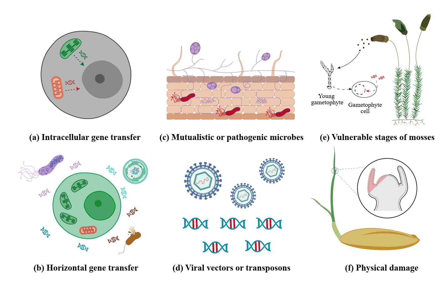 微生物互作不仅参与植物生长与适应的全过程,也可能导致遗传整合。来自微生物的水平转移基因存在于所有主要植物类群,在轮藻和苔藓植物中尤为显著。这些水平转移获得的外源基因推动了陆生植物生理机制与结构特征的重要创新。