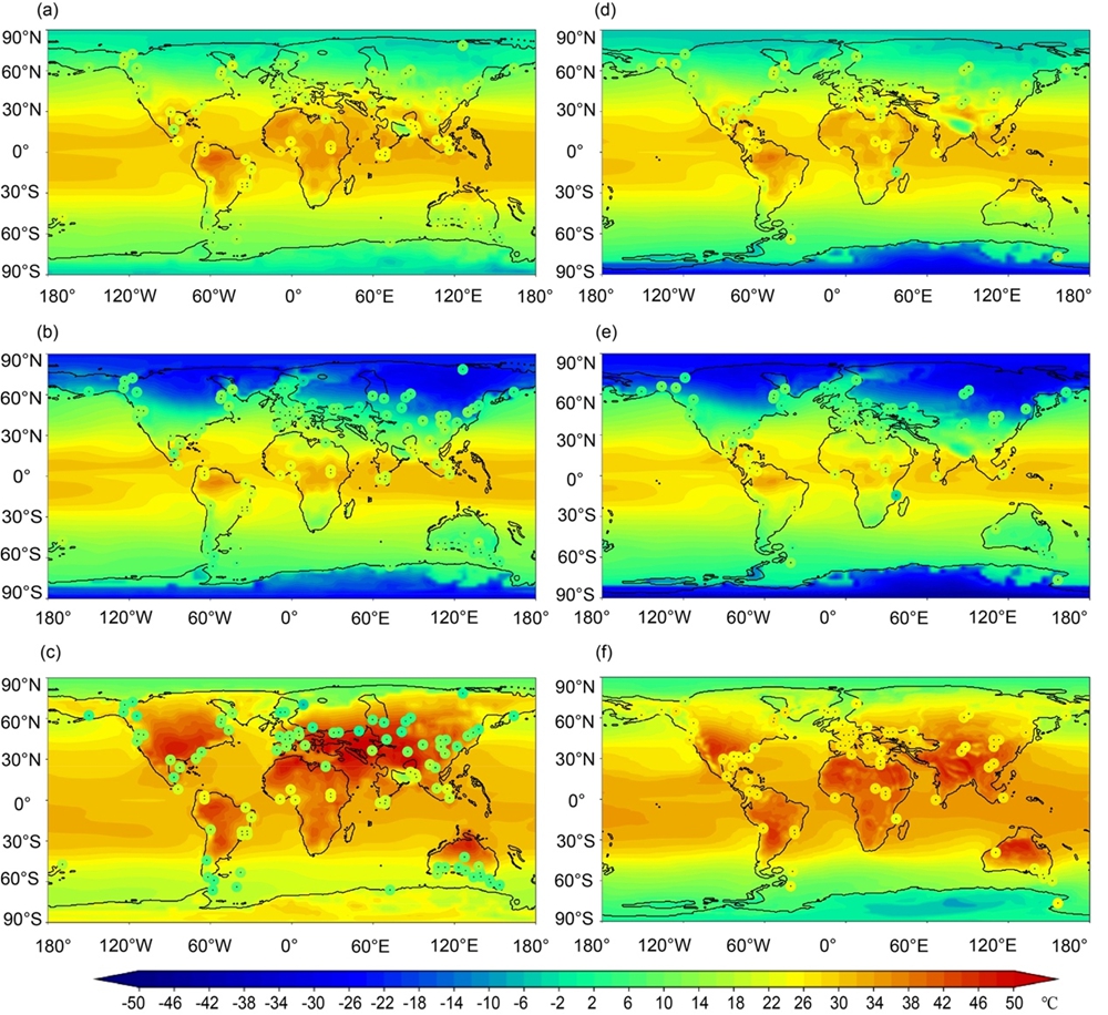 图1 基于化石数据和哈德莱中心海气耦合模式(Hadley Centre Coupled Model 3,HadCM3)模拟EOT全球温度比较。(a-c)和(d-f)分别为晚始新世和早渐新世全球年均温(annual mean temperature,MAT)、最冷月均温(mean temperature of coldest month,CMMT)和最暖月均温(mean temperature of warmest month(WMMT)。背景值为数值模拟温度,圆代表化石重建的温度。单位为℃。基于全球孢粉化石点使用共存法重建的晚始新世和早渐新世全球古气候结果源自公开发表的数据集。