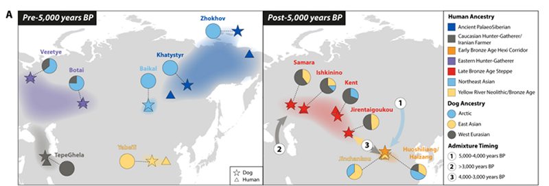 近日,由中国科学院昆明动物研究所王国栋研究员带领的国际合作团队,完成了17个古代家犬的基因组测序,其中包括来自河西走廊,新疆和内蒙古的14个中国古代家犬,这是首次获得中国古代家犬基因组。加上团队取得的已发表古基因组数据,共获得了73个古代狗基因组,构建了从东亚到西欧亚草原的家犬血统演变图谱。研究首先发现中国五千年前存在独特的家犬古老血统,随后数千年中国古代家犬逐渐出现来自西伯利亚和西方的古代家犬血统渗入,同时来自中国的古老东亚祖份也广泛扩散到了欧亚草原多处。更重要的是,团队通过与人类古基因组数据和证据对照,发现家犬数次渗入事件与人类的多次迁徙高度重合。如东西伯利亚早全新世家犬谱系与同时期人类谱系的分布高度吻合。其次,在河西走廊地区,家犬基因组中东北亚祖分的增加与人群中东北亚祖分的流入也十分同步。此外,欧亚草原地区家犬中西方祖分的增加也与古人类迁徙历史相吻合,具体而言我们发现欧亚草原前期的新石器时代家犬和东欧狩猎采集人群相关,后期的青铜时代家犬和伊朗农耕人群和高加索狩猎采集者相关。通过对比研究和多方证据的互相验证,团队最终证明,近一万年来家犬与人类存在密切共迁徙,不同时期不同人群携带各自的犬通过欧亚草原和古丝绸之路等路线进行跨洲的大迁徙,这表明了家犬与人的无与伦比亲密关系,从欧亚草原到河西走廊的家犬万年来血统流动,也映射出古代文明的互联互通。