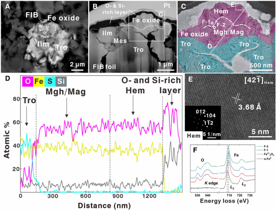 氧化还原作用是行星形成演化过程的重要组成部分。与地球不同,月球由于缺乏大气保护,在大碰撞过程中丢失了大量的水等挥发分,致使其内部具有较低的氧逸度,铁元素主要以二价和零价形式存在,整体处于还原状态。然而,随着对月球研究的深入探索,近年来月球轨道遥感利用可见近红外光谱的研究推测在月球高纬度地区可能广泛存在赤铁矿;在嫦娥五号样品研究中,首次发现了撞击成因的亚微米级磁铁矿(Fe3O4),以及在撞击玻璃质中发现Fe3+的赋存等证据,足以说明在月表以外部撞击为主的改造过程中确实存在局部的偏氧化环境。但迄今月球是否存在强氧化矿物(如,赤铁矿)仍缺乏直接的矿物学证据,关于月球表面是否广泛存在氧化作用以及氧化特征矿物一直存在较大的争议。