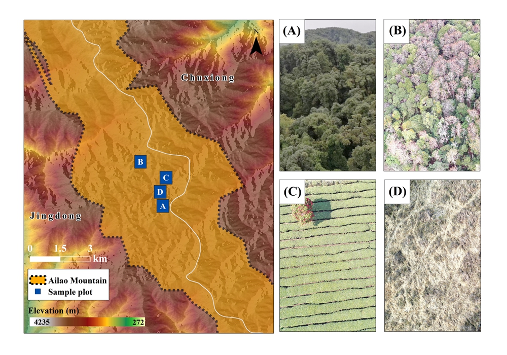图1 哀牢山四种植被类型的分布位置。(A)常绿阔叶林,(B)滇山杨林,(C)茶园,(D)草地。