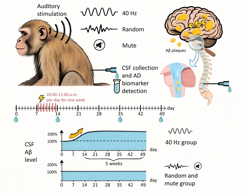 近期,中国科学院昆明动物研究所研究团队首次在非人灵长类动物中发现,40-Hz频率的听觉刺激可显著提升老年恒河猴脑脊液中的β淀粉样蛋白水平,且该效应可持续超过5周。本研究首次为将40-Hz刺激作为阿尔茨海默病(AD)的非侵入性物理治疗方案提供了关键的非人灵长类动物实验证据,同时揭示了灵长类动物模型与啮齿类动物模型之间存在显著差异。