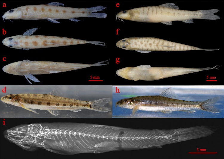 图1 沙迷鳅:(a-d) 雄性;(e-h) 雌性;(i) X-光