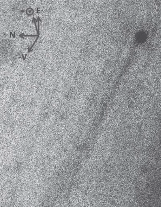 活跃小行星(Active Asteroids)是近年来确认的一类特殊太阳系小天体,具有类似小行星的轨道特征,却又呈现出彗星的视觉特征,如彗发、慧尾或亮度的异常增强等。活跃小行星为地球上水的来源提供了新的线索,也为理解小天体的物质组成、内部结构和演化过程提供了新的机会。(62412)2000 SY178是一颗位于外小行星主带的Hygiea族C型小行星,在2014年4月被偶然发现具有一条类似慧尾的结构(图1,左图)。2000 SY178的轨道半长轴3.153 AU、轨道周期为5.6年,其最近一次过近日点在2024年7月15日。