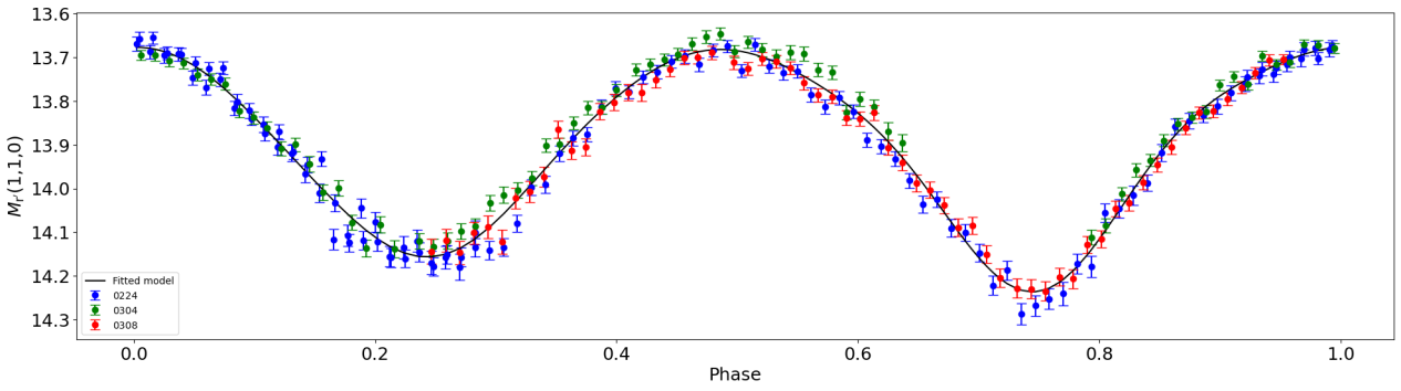 2025年2月24日、3月4日和3月8日利用丽江2.4米望远镜获得了2000 SY178高质量的光变曲线,采用Lomb-Scargle周期拟合方法获得其自转周期为3.3282小时(图2)。对获得的光变曲线采用cellinoid模型进行建模分析,获得了2000 SY178形状(图3),其六轴比分别为:a1=1.0 ± 0.0000, a2=1.3695 ± 0.0093,b1=1.6748 ± 0.0076,b2 = 1.6691 ± 0.0080, c1 = 2.0267 ± 0.0093,以及 c2 =0.0324 ± 0.0023。