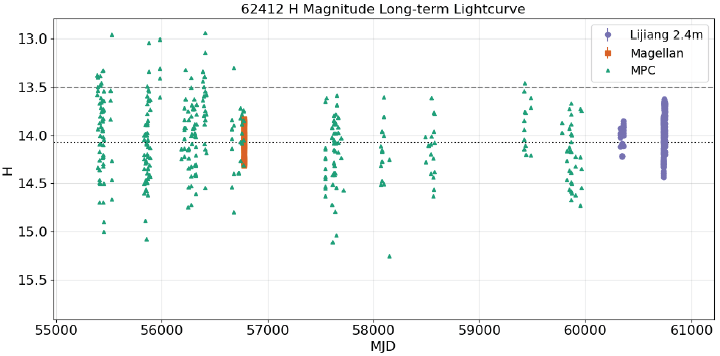 北京时间2026年1月6日,国际天文期刊《天体物理学杂志》(The Astrophysical Journal)以" Photometric Observations and Analysis of Active Asteroid (62412) 2000 SY178”为题在线发表了中国科学院云南天文台在活跃小行星活动机制和物理特性观测研究方面的成果。中国科学院云南天文台硕士研究生范相钰为论文第一作者,中国科学院云南天文台青年研究员张西亮为论文通讯作者。