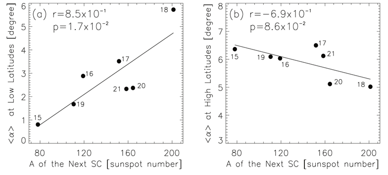 图1:较低纬度和较高纬度的黑子群倾角平均值和下个活动周强弱的关系。相关系数(r)和相关性由偶然因素导致的概率(p)都标在图中。图中的实线是相应数据的线性拟合。