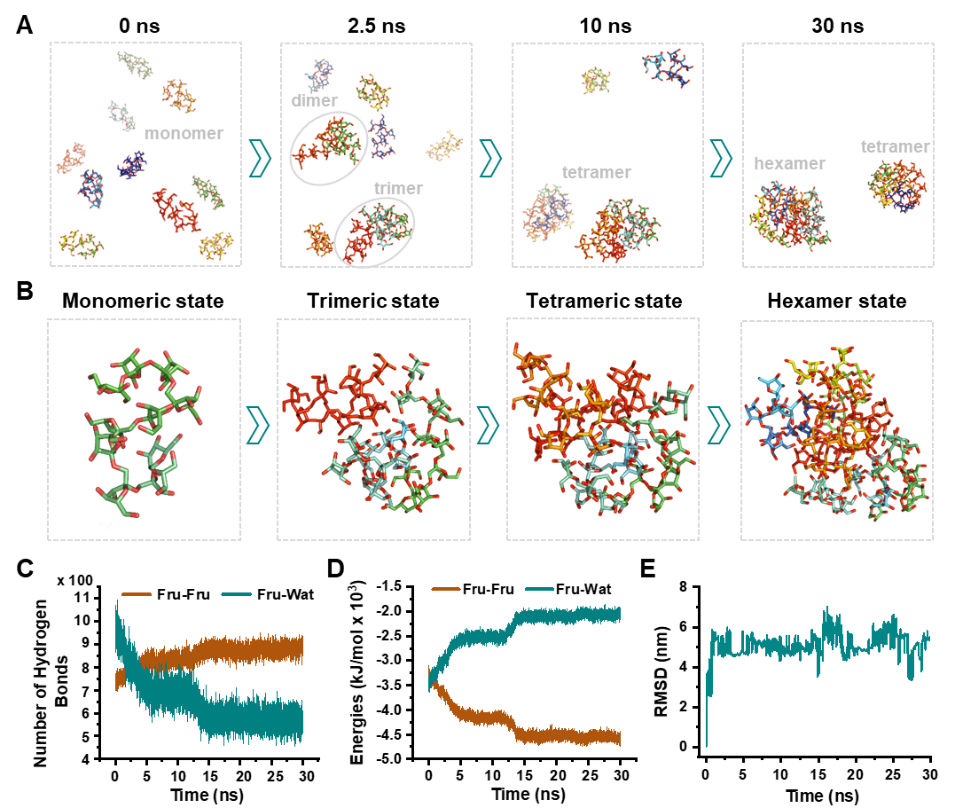近期,该团队对云南特色的一种臭参(学名为管钟党参,Codonopsis bulleyana)开展了功效活性成分的发掘研究。结果发现,多糖是其主要的物质成分(粗多糖含量高达16%)。研究人员从中纯化并解析了三种不同分子量的多糖,证实它们均为同源的、由β-(2→1)糖苷键连接的线性菊粉型果聚糖。令人意外的是,这些多糖在水溶液中均能自发组装成稳定的超分子纳米球或圆盘结构。分子动力学模拟证实,这一组装过程是由分子间氢键热力学驱动的自发行为。