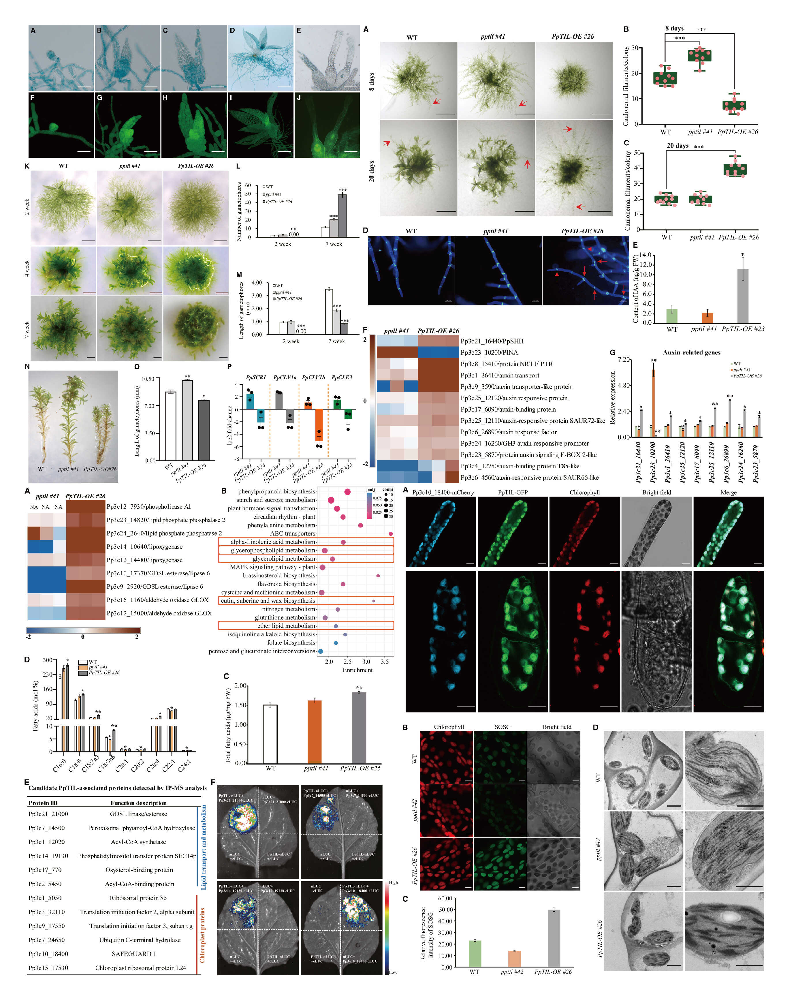 载脂蛋白的经典功能为参与脂质运输和代谢,该研究也证实了PpTIL在小立碗藓脂质代谢中发挥关键调控作用。转录组和脂质组分析显示,PpTIL基因缺失和过表达株系中多个脂代谢相关基因表达显著变化,过表达株系的总脂肪酸含量提升约20%,其中棕榈酸(C16:0)、硬脂酸(C18:0)、亚麻酸(C18:3)等膜脂重塑关键脂肪酸含量显著增加,而基因缺失突变体中苔藓适应逆境的超长链多不饱和脂肪酸(C20:1、C20:2、C22:1、C24:1)含量显著降低。通过免疫共沉淀-质谱(IP-MS)和双荧光素酶互补实验,研究人员鉴定出多个PpTIL的互作蛋白,包括GDSL脂肪酶、磷脂酰肌醇转移蛋白等脂代谢关键蛋白,进一步证明PpTIL通过与脂代谢相关蛋白互作,调控脂质的合成与运输。同时,PpTIL还与叶绿素降解相关的PAHX(phytanoyl-CoA hydroxylase,植烷酰辅酶A羟化酶)互作,参与叶绿素代谢,影响植株的衰老。