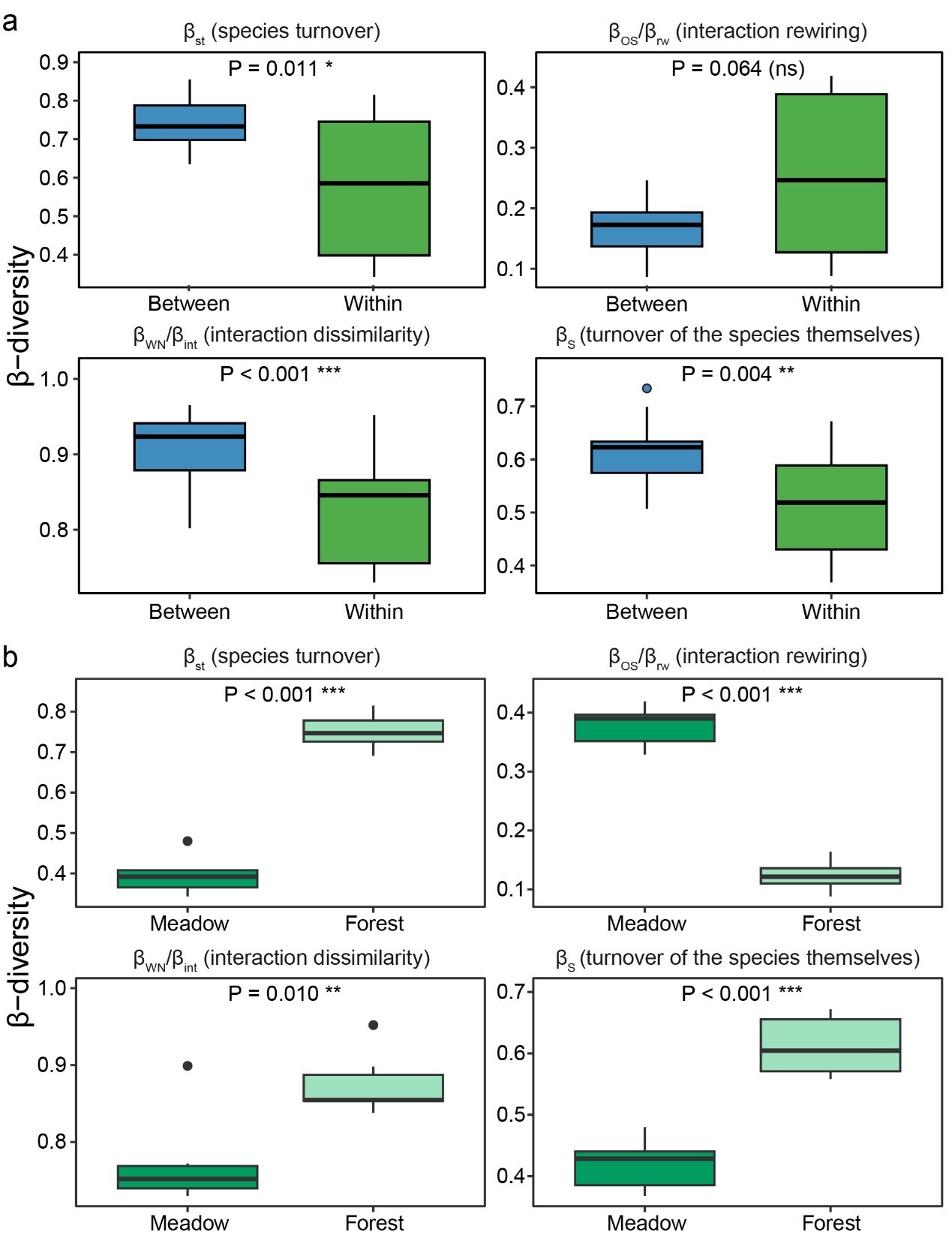 图3 生境间及生境内网络β多样性组成的比较。(a)展示了不同生境间及生境内的网络β多样性各组成部分(βWN/βint、βst、βOS/βrw和βS)的比较;(b)分别展示了草甸和森林群落内的变化