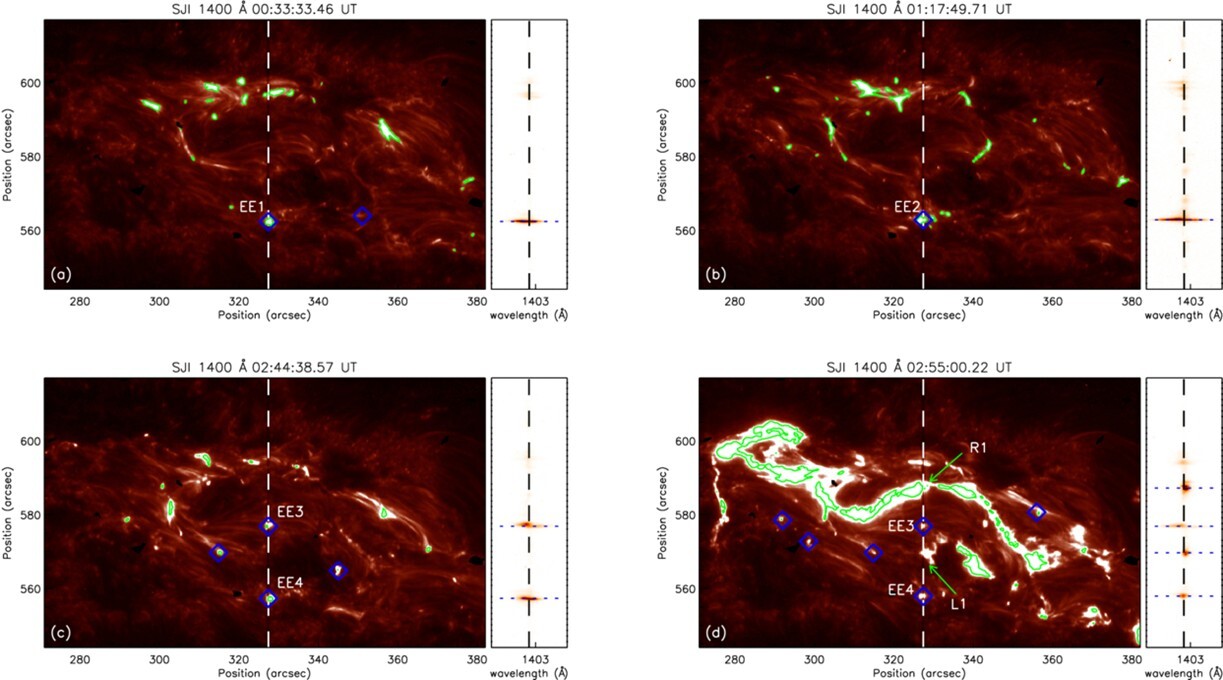图1:NOAA 13213活动区中过渡区爆发事件(EEs)的概览,展示了IRIS在1400 Å波段的狭缝成像图(SJIs)以及对应时刻(00:33:33 UT、01:17:50 UT、02:44:39 UT、02:55:00 UT)的Si IV 1403 Å谱线。每张SJI图中,白色垂直虚线标示了光谱仪狭缝的位置。EE1–EE4及蓝色菱形符号标记了爆发事件的位置。绿色等值线勾勒出强度超过视场最大值5%的区域。在光谱图中,黑色垂直虚线标示了Si IV 1403 Å谱线的线心波长,黑色水平虚线则标示了爆发事件、耀斑带及环结构所在的空间位置。