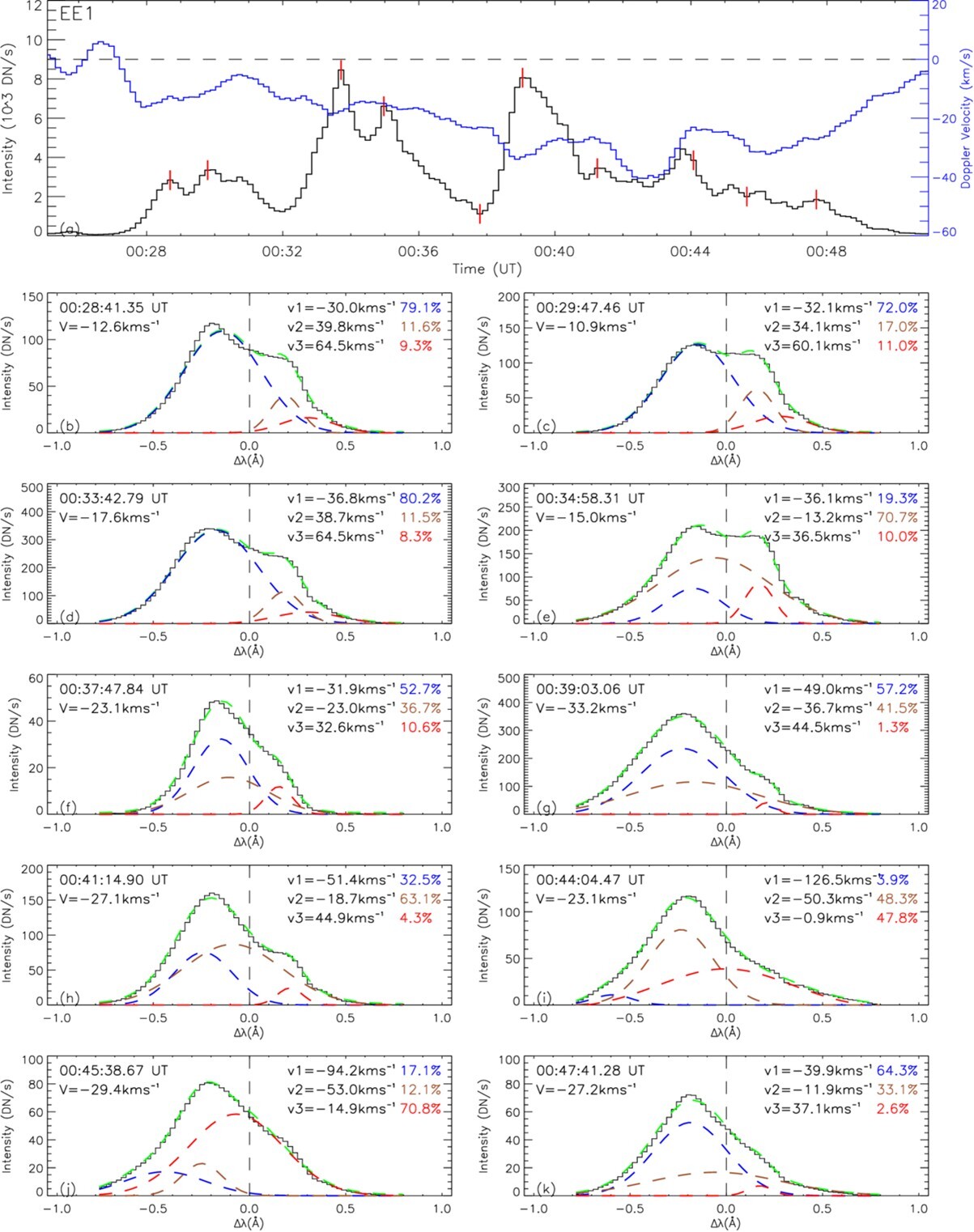 图2:(a)Si IV 1403 Å谱线积分强度(黑色曲线)与多普勒速度(蓝色曲线)的时间演化。红色短竖线标示了图2中蓝色菱形标记的具体位置。(b)–(k)EE1的Si IV 1403 Å谱线轮廓。各子图中,黑色垂直虚线标示了Si IV 1403 Å谱线的静止波长。绿色虚线曲线表示多高斯拟合的合成轮廓,蓝色、红色和橙色曲线分别表示各个高斯分量。全局速度v由拟合轮廓的质心导出。速度v₁、v₂v₃分别对应各高斯分量的多普勒位移。
