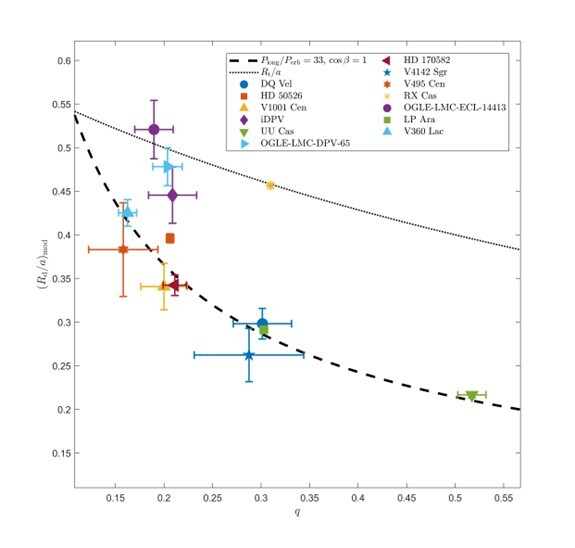 图1: 13个DPV样本的模型预测盘半径随质量比q的变化。虚线代表取Plong/Porb=33和cosβ=1时的理论预测,点线代表潮汐截断半径。