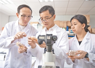 赵琪(中)和团队成员在查看菌丝生长情况。
