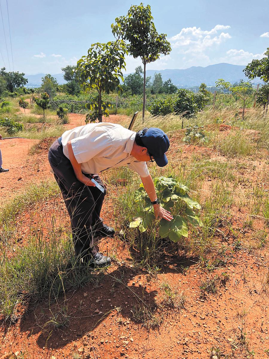 Sun Weibang checks the growth of a special kind of parasol tree, an endangered tree once considered extinct in Yuanmou, Yunnan province. [Photo provided to CHINA DAILY]