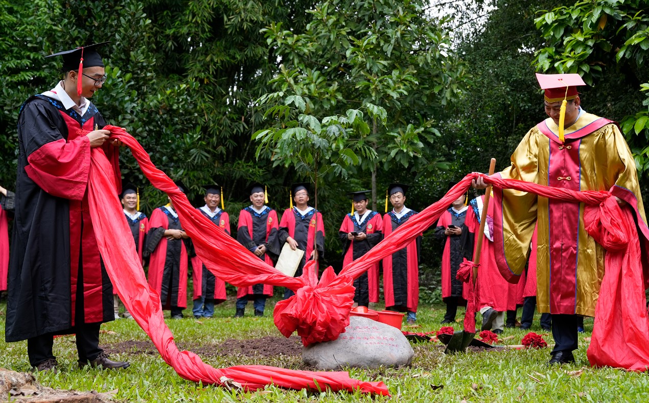 上午9时,2025届毕业生植树仪式在学子林举行。毕业生与导师们共同为《中国生物多样性红色名录-高等植物卷》中的濒危植物云南无忧花(Saraca griffithiana)培土浇水,并为毕业纪念树揭牌。这一延续20年的传统,不仅是版纳植物园人才培养的独特印记,更象征着毕业生们在此深深扎根,即将向阳而生。