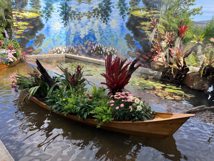二、兰花小船。水池上有兰花搭配其中的两艘小船停泊水面之上,仿佛进入印象派的诗意画卷,渲染出兰花山野精灵的仙气,在繁茂的花丛,让参观者开启视觉盛宴,同时可以打卡拍照。