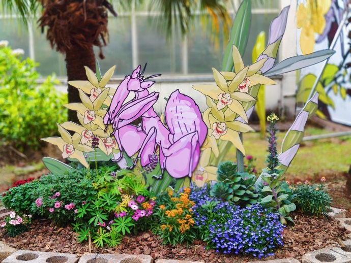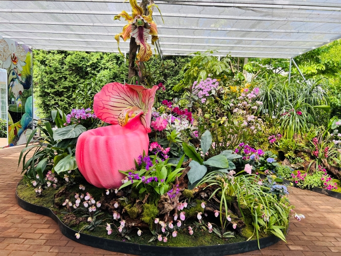 此次兰展以“兰野仙踪”与“童话秘境”为主题,将兰科植物的科学和艺术之美相结合,展出将近400种(含品种)兰花。由室内和室外展区两个部分组成,室内展区保持了兰花馆主馆“空谷幽兰”的景观效果,主要以原生种为主,展现迁地保育成果;室外展区结合本次“兰野仙踪”的主题,设立了生物多样性展区、兰花小船、主展区、兰花打卡点等区域,将怪诞的童话风格和兰花的科学内容,通过布展形式与硬叶兜兰、大魔鬼石斛巨型兰花小品融合在一起,打造一个属于兰花的科学童话世界。室外展区由以下几部分组成: