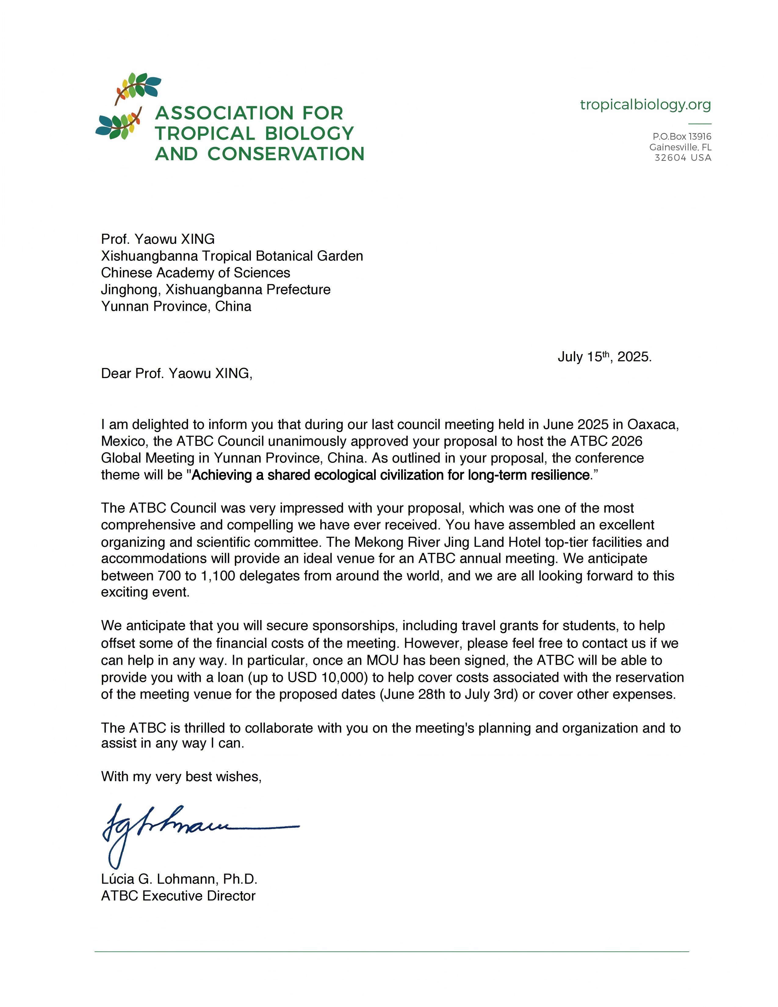 7月15日,中国科学院西双版纳热带植物园(以下简称“版纳植物园”)收到国际热带生物学与保护协会(Association for Tropical Biology and Conservation,ATBC)执行主任Lúcia G. Lohmann正式来函,宣布版纳植物园获得2026年ATBC全球会议主办权。