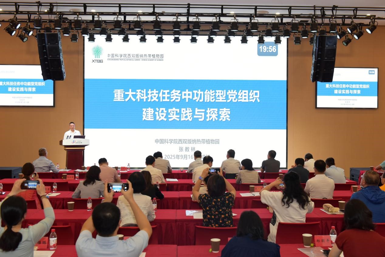 张教林在会上作题为《重大科技任务中功能型党组织建设实践与探索》的报告,介绍版纳植物园依托“高质量产胶植物资源挖掘与利用”B类先导专项,率先组建跨部门功能型党组织的创新实践与经验。其核心做法是功能型党组织与科技攻关突击队双轨并行,建立“政治引领与科研攻关协同、组织覆盖与人才培养并重、任务攻坚与精神传承结合、资源整合与产业对接联动”的四维融合机制,有效激发了党支部的组织优势,转化为推动科技创新的动力。版纳植物园牵头构建了橡胶育种与生产的“政用产学研”创新合作体系,不仅引领科技创新与成果转化,也促进了先导专项与国家重大科技任务的有效衔接。