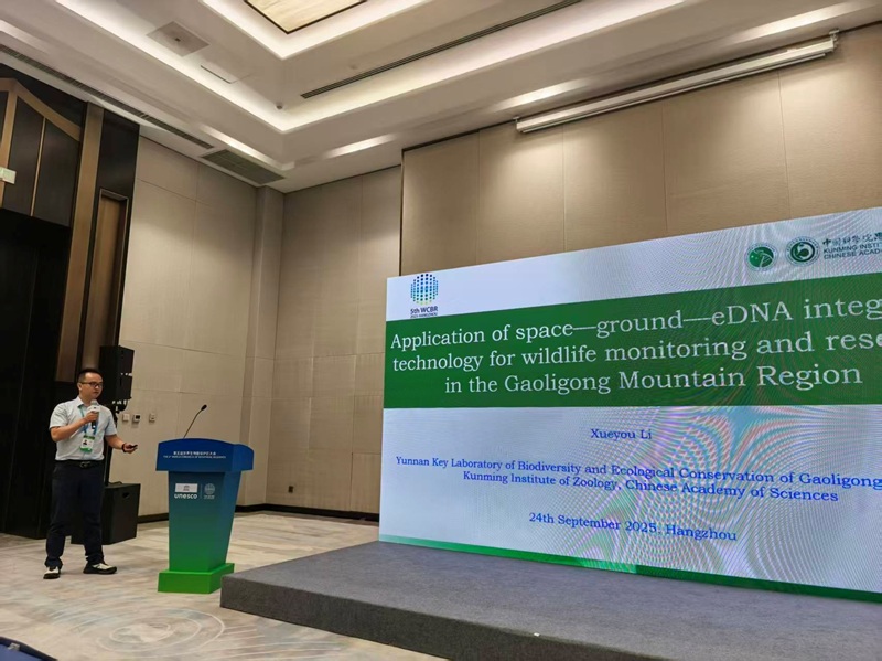 9月24日,中国科学院生物多样性委员会举办网络化监测体系边会,共同探讨自然保护地监测体系创新与管理应用。省重副主任李学友副研究员作了题为“Application of space—ground—eDNA integrated technology for wildlife monitoring and research in the Gaoligong Mountain Region”(高黎贡地区野生动物“天—地—生”一体化监测网络构建与研究)的交流报告。报告展示了昆明动物所针对高黎贡山野生动物,已开展了系统性、跨类群、多维度的科考和持续监测。通过不懈努力,目前高黎贡山已厘定本土脊椎动物共1363种(兽类216、鸟类796、爬行类111、两栖类92、鱼类148)——这一数据刷新了该区域脊椎动物多样性记录,也进一步凸显高黎贡山独特的生态价值。目前省重已建立覆盖高黎贡全境的网格化红外相机监测网络,探索应用eDNA宏条形码技术开展跨类群、大尺度、定量分析脊椎动物多样性与分布格局,已构建完成高黎贡地区野生动物多样性数据管理和可视化平台,可按物种、时间(年、月、时间段)、空间(纬度、海拔等)检索、分权限共享多样性数据,可视化呈现野生动物时空分布和动态变化规律,为保护区生物多样性精细化管理和后续保护成效评估提供了重要的科技支撑。