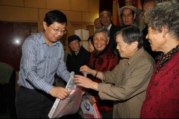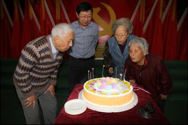 冯新斌为75-80岁老同志发放纪念品 冯新斌与75-80岁老同志代表一起吹蜡烛