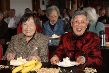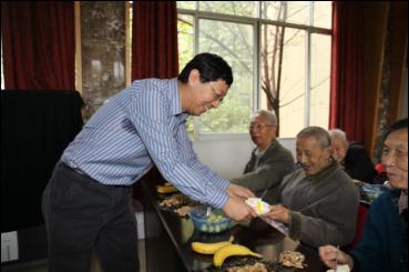 冯新斌为老同志分发蛋糕 老同志们在重阳节之际一起欢度生日
