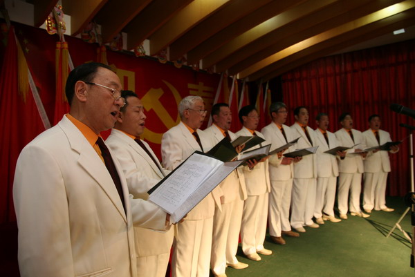 主持人韩涛(左)、张新(右) 职工合唱团小合唱《怀念战友》、《我像雪花天上来》