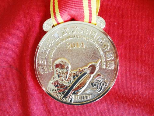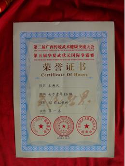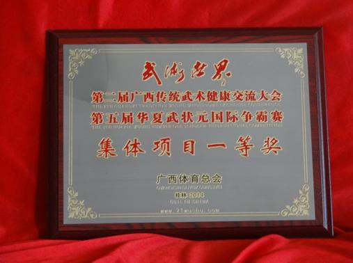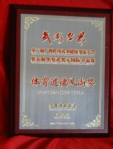广西体育总会于2014年5月15-17日在桂林举办了第二届广西传统武术健康交流大会和第五届华夏武状元国际争霸赛。参赛队员除各省市和港、澳、台地区的武林高手之外,还有来自美、英、法、日、巴西、克罗地亚等外国武术强将。地化所太极队员勇于面对挑战,发挥出色,受到裁判高度称赞,荣获健身气功八段锦团队金牌,王典凤、曾祥碧荣获32式太极剑金牌,刘殿章、巩积文荣获24式太极拳金牌。此外,大会组委会还为该队颁发了体育道德风尚奖。  参赛队员在颁奖台上合影 集体项目一等奖奖牌  体育道德风尚奖奖牌 获奖金牌  王典凤老师个人项目获奖证书 |