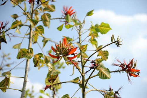 在百花园的一角,你可以看到这样一种植物:花开得鲜红绚烂,叶子有金黄色的叶脉,可谓花叶俱美,这就是著名的观赏植物——金脉刺桐!