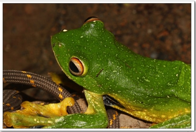 嘘~,似乎有一种特别的蛙声。一位野外经验丰富的女生用手电往树上一照,枝桠上居然停着一只翠绿的青蛙,“黑蹼树蛙!”,多么可爱的家伙!于是引来一串密集的闪光灯。当我们抱怨它停得太高时,有人在低处发现了一只,两只、三只......哇!这么多的青蛙,兴奋得我们无处安放相机。