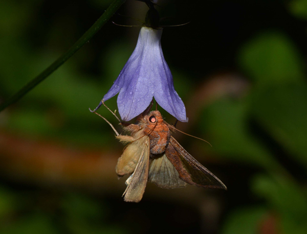 图4 夜蛾在访问一朵云南沙参的花。这种花白天被蜂访问,晚上被夜蛾访问,昼夜都忙。