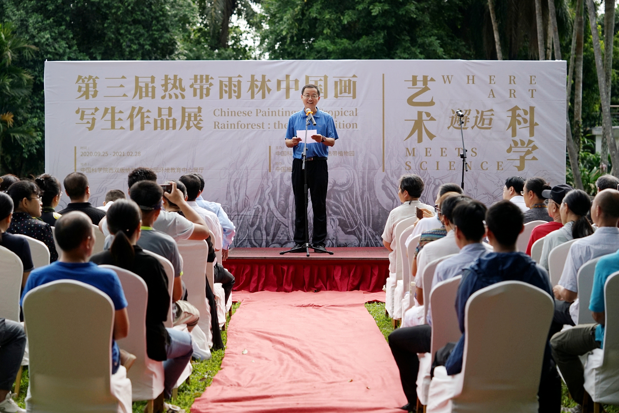 开幕式由版纳植物园副主任胡华斌主持。杨永平代表版纳植物园致开幕词,他对艺术家和各界宾客的到来表示欢迎。杨永平指出艺术和科学是相通的,首先艺术家和科学家都是美的发现者,其次艺术家和科学家都是美的陶醉者,最后艺术家和科学家都是知识和美的传播者。在疫情背景下,画家们通过艺术作品传递出的热带植物欣欣向荣的精神给社会带来莫大的鼓舞。希望艺术家和科学家就像热带雨林生态系统一样和谐,各美其美,美美与共。岩香代表版纳州委宣传部对艺术邂逅科学画展的举办表示热烈祝贺,他希望艺术和科学的融合能把美丽的西双版纳介绍给更多人认识。陈楠代表西双版纳州美协发言,他认为画展在版纳植物园这个世界级植物保存基地举办可以说是天时地利人和,相信艺术邂逅科学画展将成为具备全国影响力的画展。画家苏甦表示热带雨林的奇花异卉打开了画家的眼界和想象的空间,全国各地的画家慕名在版纳植物园写生、教学,这里已成中国花鸟画家写生的圣地和中国现代花鸟画家成长的摇篮,这在全世界也是少有的现象。