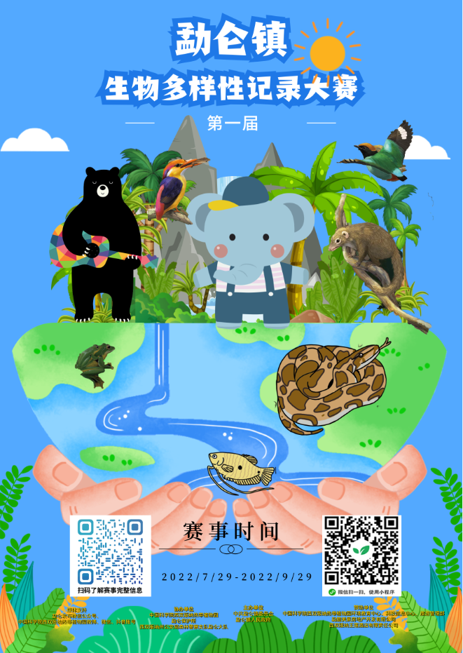 第一届勐仑镇生物多样性记录大赛:7月29日至9月29日,版纳植物园联合中共勐仑镇委员会、勐仑镇人民政府、西双版纳州公安局森林警察支队勐仑大队、云南西双版纳国家级自然保护区勐仑管护所等多家单位,举办“记录勐仑生物多样性之美”·第一届勐仑镇生物多样性记录大赛,旨在深入贯彻习近平生态文明思想,广泛动员当地社区居民关注身边的生物多样性。