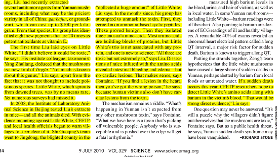 在国家科技部973项目和国家基金委重点项目的资助下,中国科学院昆明植物研究所刘吉开课题组与中国疾病预防控制中心曾光课题组等合作,从云南一种新的小白菌(Trogia sp.)中发现了毒性成分:新的非蛋白质氨基酸,并初步证明该菌是30多年来导致云南不明原因猝死的罪魁祸首,相关报道见Science 2010, 329: 132-134。