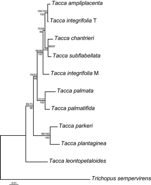 蒟蒻薯属(Tacca)植物属于薯蓣科(Dioscoreaceae),全世界约有15种。该属植物具有非常奇特的花部结构,表现在有的物种具有聚伞状的伞形花序被大而显著的大苞片包围着,并且有许多长而飘逸的丝须状小苞片,而有的种类小苞片却不发达或是完全没有须状小苞片,在一个很小的属中具有如此多样的花部形态性状差异,反映了该属植物不同的种类在长期的演化过程中对其生境的适应以及自然选择对其形态特性的作用,也为人们利用现代分子系统学方法研究这些形态性状的进化历史提供了很好的机会。