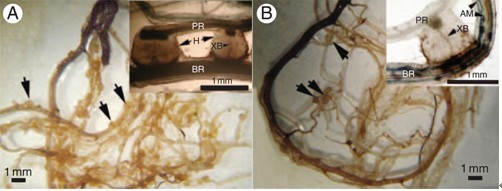 A.未接种AM真菌时三色马先蒿根部的吸器发生状况;B.接种根内球囊霉(Glomus intraradices)后三色马先蒿根部的吸器发生状况。
