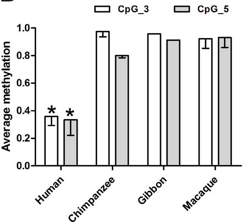 最近,中科院昆明动物所宿兵研究员实验室(助理研究员石磊与博士研究生林强)对4个大脑容量调控关键基因(ASPM、CDK5RAP2、CENPJ和MCPH1)上游非翻译区(5’-UTR)的甲基化模式进行了系统的分析。他们通过亚硫酸氢盐测序比较了4个灵长类代表物种(人类、黑猩猩、长臂猿和猕猴)大脑前额叶中这4个基因的甲基化模式的差异。研究结果发现,CENPJ基因在人类大脑中是低甲基化的,而在其他所有非人灵长类大脑中的甲基化水平是人类的2-3倍;理论上,低甲基化往往对应高的基因转录活性。如预期的一样,他们在人的大脑中检测到比非人灵长类高得多的CENPJ的表达。因此,在人类大脑中CENPJ的低甲基化和高表达提示这一人类特异的表观遗传变化可能是伴随人类起源而发生的,并且是可遗传的。