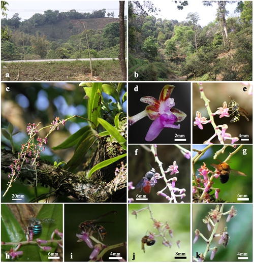 世界上有27,000多种兰科植物,广泛分布于除两极和沙漠的各种生态系统中,兰科植物算得上是地球上最成功的植物类群之一。兰科植物的传粉者和共生真菌对兰科植物多样性的形成具有重要作用,特别是传粉者被认为在兰科植物极其多样性的物种形成中起着重要作用。 西双版纳地处热带亚洲的北缘,是我国兰科植物最为丰富的地区之一,有兰科植物400余种。其中,隔距兰Cleisostoma linearilobatum是最为常见的一种,特别是在海拔1000~1600米的龙山林和古茶园,非常丰富。隔距兰在不同的生境中为什么能够如此成功的生存呢?中国科学院西双版纳热带植物园濒危植物迁地保护和再引种研究组的在职博士研究生周翔,在一个龙山林和古茶园中对隔距兰的繁殖生态学开展了比较研究,发现在这2个研究地点,隔距兰不同年份的自然结果率都能保持相对稳定,这得益于其具有泛化的传粉系统。研究人员共观察到7种不同的昆虫为隔距兰传粉,虽然2个研究点的传粉昆虫组成不同、不同昆虫不同年份的访花频率也不同,但不同昆虫的组合确保了隔距兰能取得稳定的繁殖成功。相关研究结果以Different pollinator assemblages ensure reproductive success of Cleisostoma linearilobatum (Orchidaceae) in fragmented holy hill forest and traditional tea garden为题,在线发表于《Scientific Reports》。 西双版纳具有丰富的兰科植物,但由于土地利用方式的改变和过渡采集,对兰科植物的保护已经刻不容缓。在就地保护方面,除了各级自然保护区外,传统的古茶园和龙山林也保护了大量的兰科植物物种,本研究结果也说明,虽然很多龙山林和古茶园已经被严重片段化,但仍是很多兰科植物的避难所,特别对那些具有泛化传粉系统的物种具有重要的作用。 该研究的龙山林和古茶园,以及隔距兰的花序和不同的传粉者 |