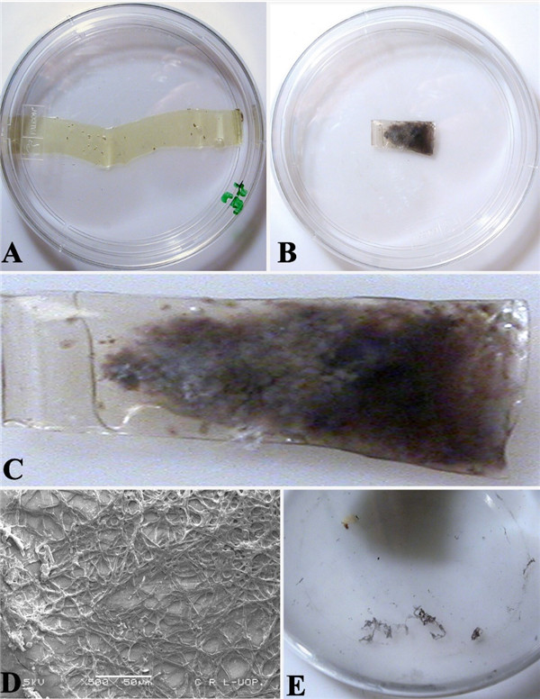 图2. 在液体MSM(2%葡萄糖)中孵育了三周的PU表面上的塔宾曲霉菌。(A)灭菌PU膜,(B&C)PU膜在具有2%葡萄糖的液体MSM中孵育21天后,(D)在PU膜表面上生长的塔宾曲霉菌,以及(E)两个月后在MSM介质里溶解的PU膜。