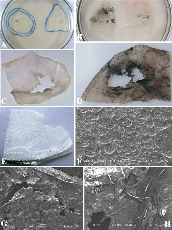 图1. 聚氨基甲酸酯(PU)表面生长的塔宾曲霉菌,(A)用塔宾曲霉菌接种并以PU无菌膜覆盖的SDA板,(B)在孵育4天后PU膜转移到MSM琼脂板,以及(C)三周后从MSM琼脂平板上回收的PU膜,(D)在SDA平板上温育两周的降解掉的PU膜,(E)对降解的PU膜D的控制,(F)对照E的SEM,(G和H)测试D的SEM。
