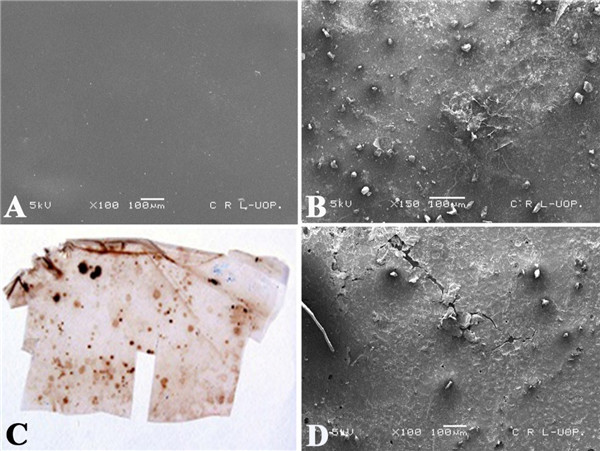 图3. 掩埋在土壤中四个月的聚氨酯膜的扫描电子显微镜照片(A)对照PU膜的SEM,(B)埋在土壤里一个月的PU膜的SEM,(C)埋在土壤里四个月的PU膜,(D)埋在土壤里四个月的聚氨酯膜的SEM。