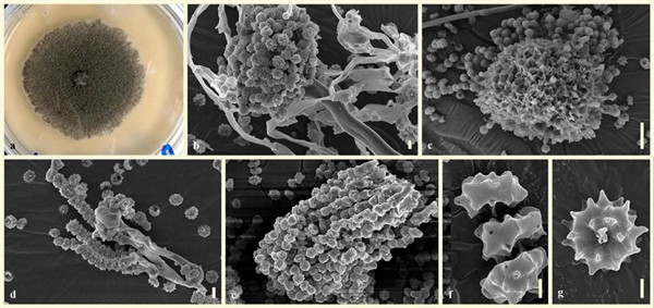 图4. 塔宾曲霉菌Aspergillus tubingensis (a)在MEA上培养20天之后,电竞扫描图(b)菌丝,茎秆和孢子囊(c)孢子囊上未成熟的孢子,(d)具有双层结构的分生孢子和孢子囊,(e)孢子囊上的分生孢子(悬臂),(f)分生孢子显示叶片网状的饰物和侧翼为叶片顶部的赤道沟,(g)单个分生孢子。比例尺:A= 70 mm culture plate, B=2µm, C=10 µm, D=3 µm, E=3µm, F=1µm, and G=1µm。